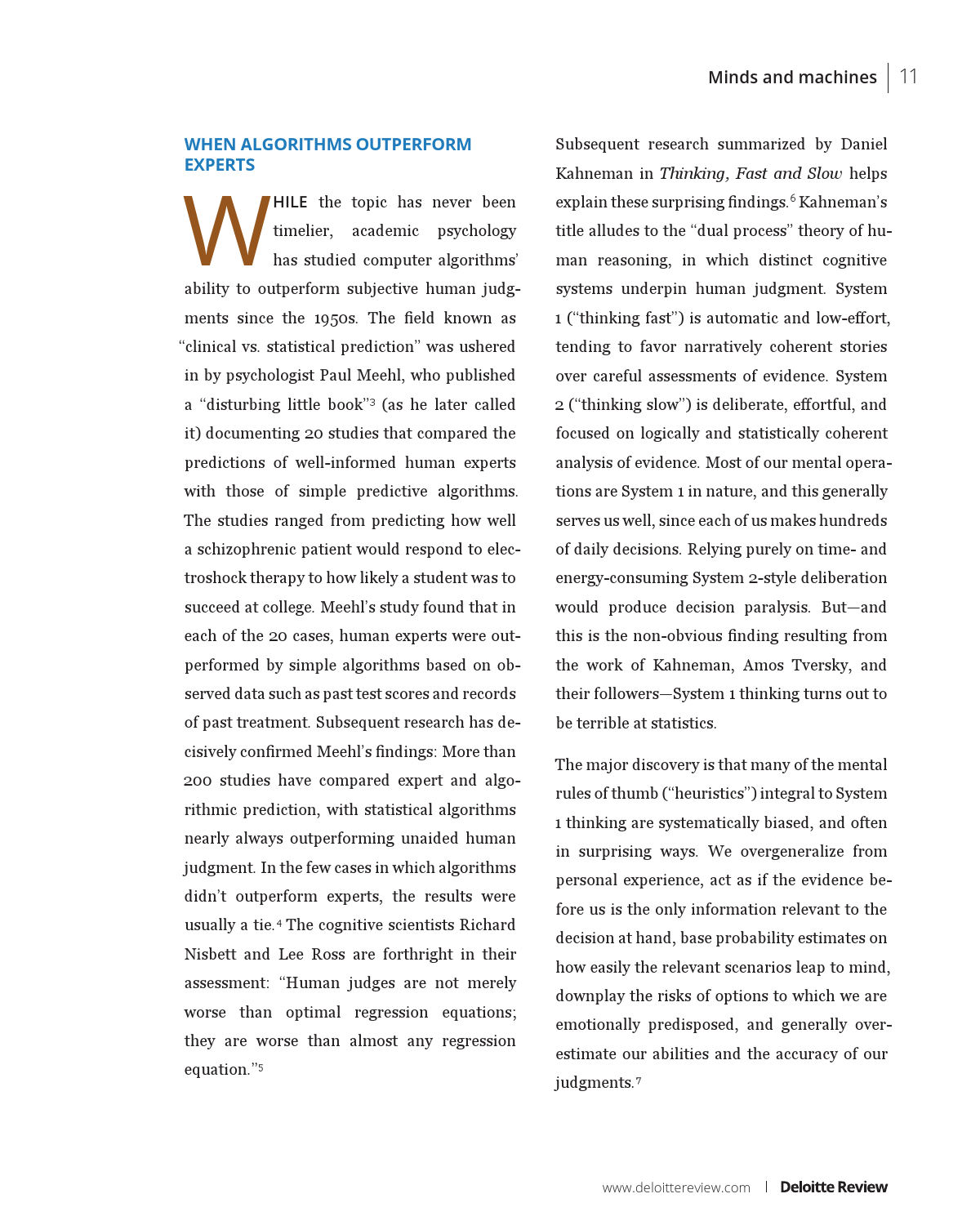 虽然这一话题最近才变得火热,但是,早在20世纪50年代,心理学学术专家的研究已经发现,计算机算法在判断上是强过主观的人类的。“临床预测 VS 统计预测”领域由心理学家Paul Meehl开创,他出版了一本“令人不安的小书”(他自己对书的称呼)。记录了20个研究案例,这些案例对著名人类专家和简单的预测算法在预测上的对比,其中包括预测精神分裂患者会对电击疗法作何反应、一名学生在大学里成功的可能性等等。Meehl的研究发现,20个案例中,人类专家预测的准确率被基于观测数据的简单算法全面超越。后续的研究更加压倒性地证明了Meehl的发现:有超过200个案例对专家和算法的预测进行了对比,数据算法几乎一直都比单独的人类判断要好。有少数几个例子中,机器比人类表现得差,但是二者的准确度非常接近。