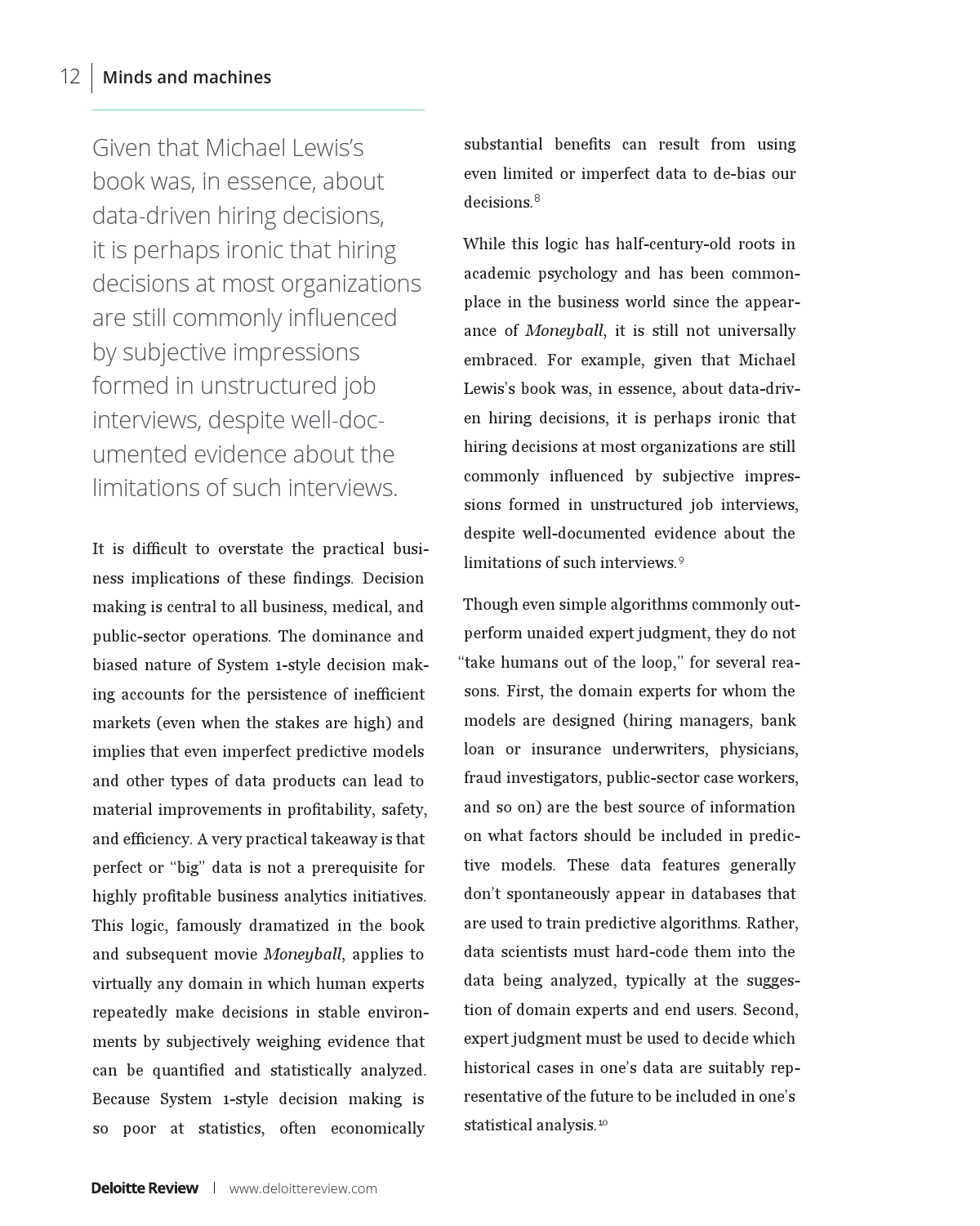 虽然这一逻辑在心理学学术研究中已经拥有超过半世纪的基础,在商业世界中也变得非常常见,特别是《点石成金》出现以后,不过,它至今还没有获得全世界的拥护。比如,考虑到Michael Lewis的书从本质上看是关于数据驱动的雇佣决策,可能有点讽刺的是,在大多数的机构中,雇佣决策仍然普遍地受到主观印象的影响,这些印象来自非正式的求职面试,虽然有大量的研究已经证明了这些面试的局限性。