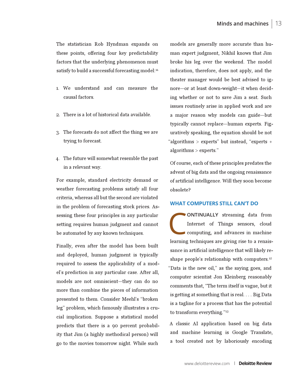 最后,即使建立了模型并进行了部署,不同情况下,模型的预测的可用性上,人类的判断也还是有必要的。毕竟,模型并不是万能的,除了把得到的信息组合以外,它们干不了其它的事。想象Meehl提出的“断腿问题”:假设数据模型预测,Jim有90%的可能性会在明天晚上去看电影。虽然模型在总体上比人类准确度更高,但是人类预测专家Nikhil知道Jim周末发生意外,腿折了。在这样的情况下,Nikhil 就不会被采用模型的预测,然后建议电影院经理最好不要给Jim保留位置。