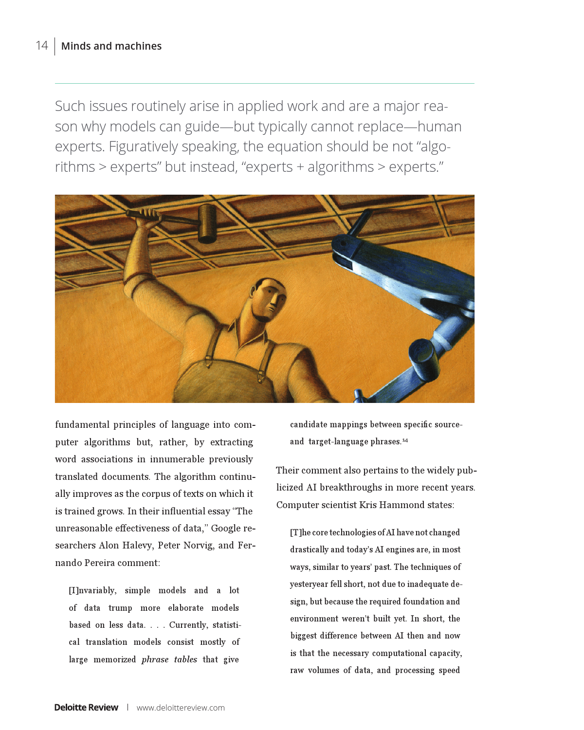 一个基于大数据和机器学习的典型AI应用就是谷歌翻译。谷歌翻译工具的开发,不是将语言的基本规则编码为计算机算法,而是从无数先前翻译的文档中提取词语的关联。随着训练该算法的文本语料库的增长,该算法也得到不断的改进。在他们的影响力的文章“数据的有效性不合理,”谷歌的研究员Alon Halevy、Peter Norvig和Fernando Pereira在他们颇具影响力的论文“The unreasonable effectiveness of data”中评论道:
