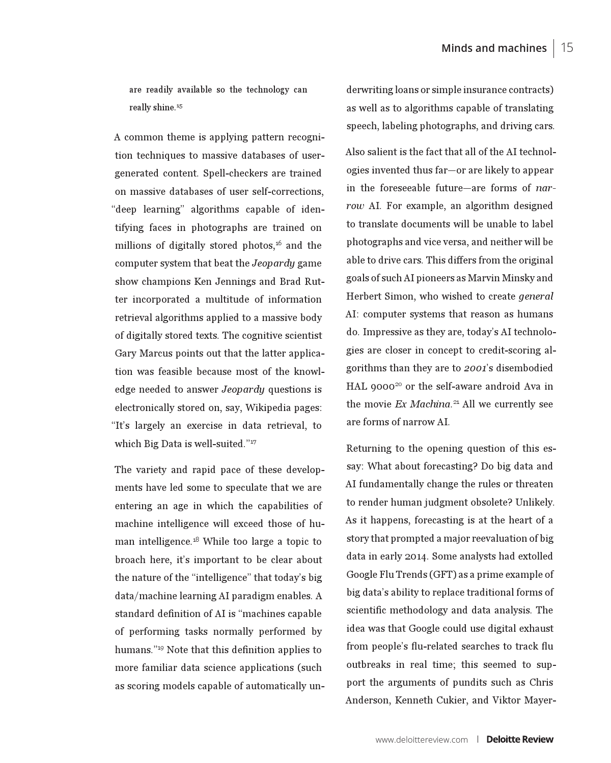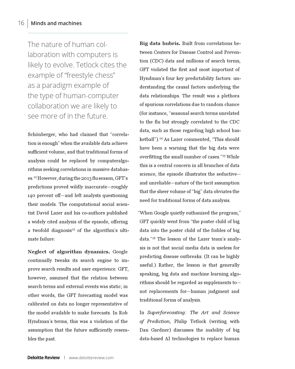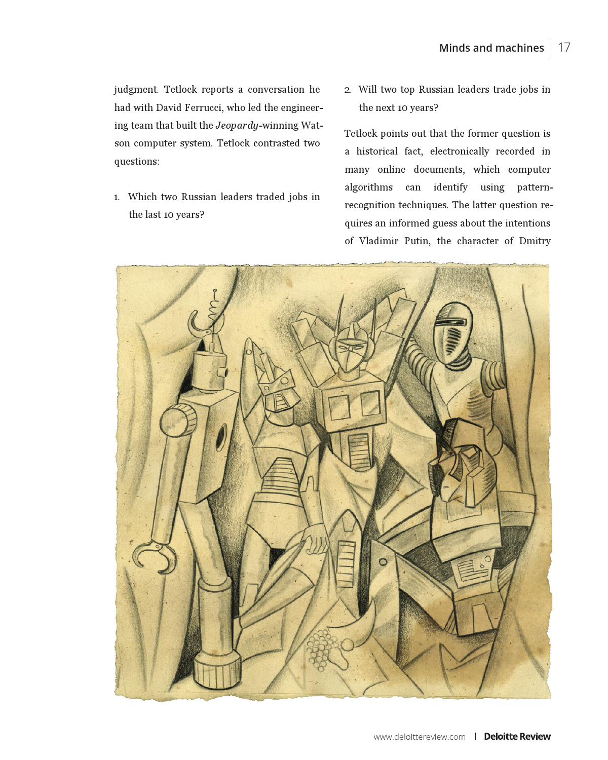 Philip Tetlock与Dan Gardner共同撰写了In Superforecasting: The Art and Science of Prediction,讨论以大数据为基础的AI技术无法取代人的判断。Tetlock报告了他与David Ferrucci的谈话,Ferrucci领导工程团队开发了在《危险边缘》游戏中获胜的Watson系统。Tetlock提出了2个问题: