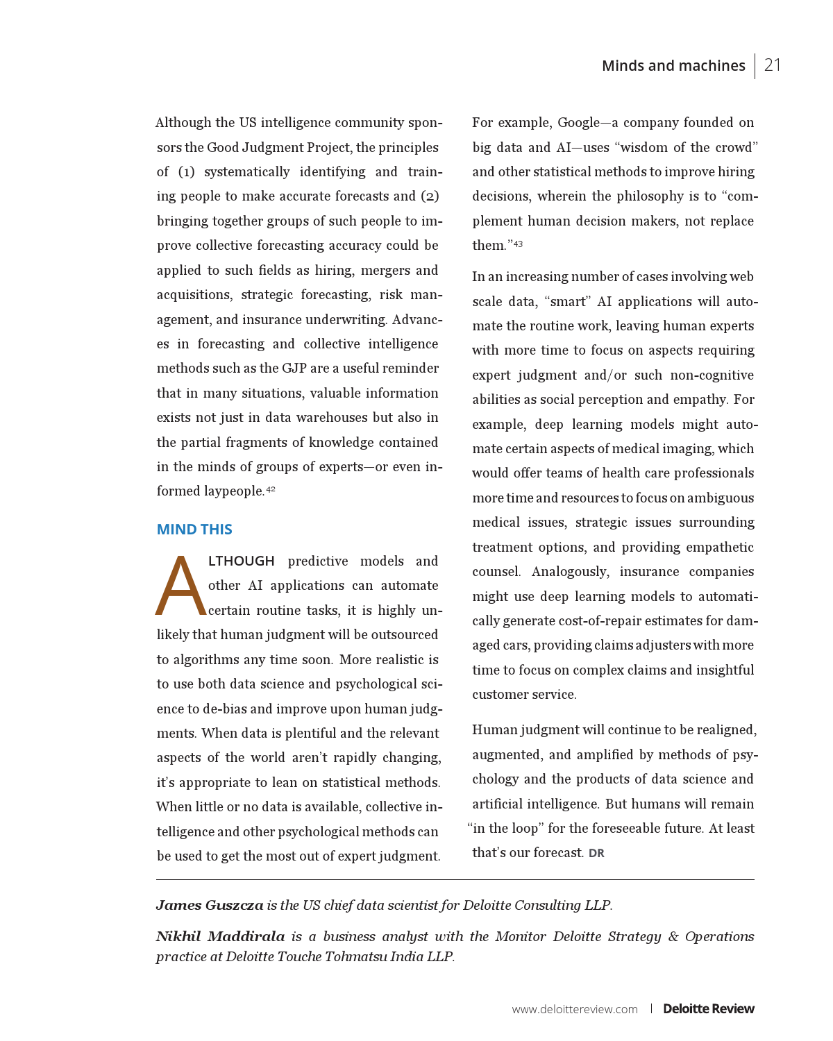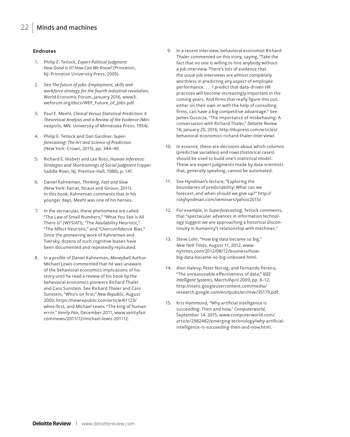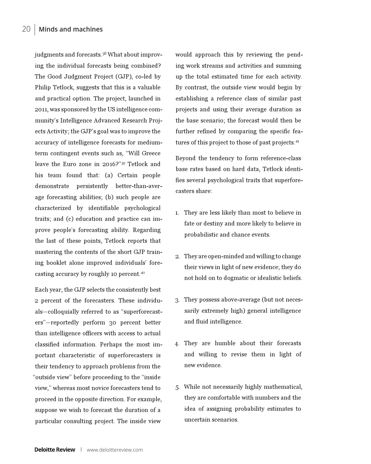 Philip Tetlock与Dan Gardner共同撰写了In Superforecasting: The Art and Science of Prediction,讨论以大数据为基础的AI技术无法取代人的判断。Tetlock报告了他与David Ferrucci的谈话,Ferrucci领导工程团队开发了在《危险边缘》游戏中获胜的Watson系统。Tetlock提出了2个问题: