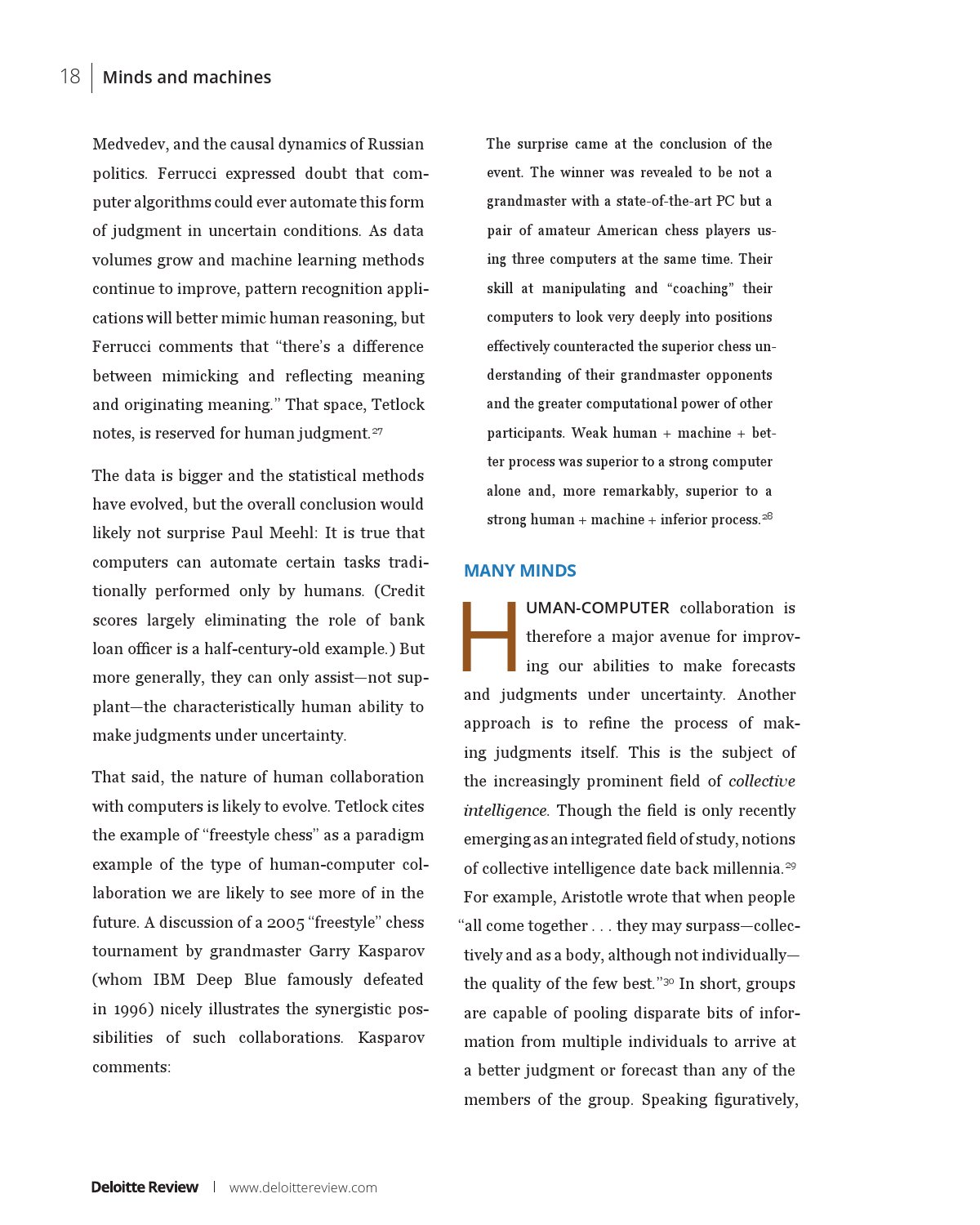 这就是说,人类与计算机合作的性质很有可能发生变化。Tetlock引用“自由国际象棋”作为人机合作的典型例子,我们在未来可能会看到更多这样的例子。Garry Kasparov(被IBM深蓝计算机在在1996年击败)对2005年的自由国际象棋的讨论就很好地说明了这种合作的可能性。Kasparov说: