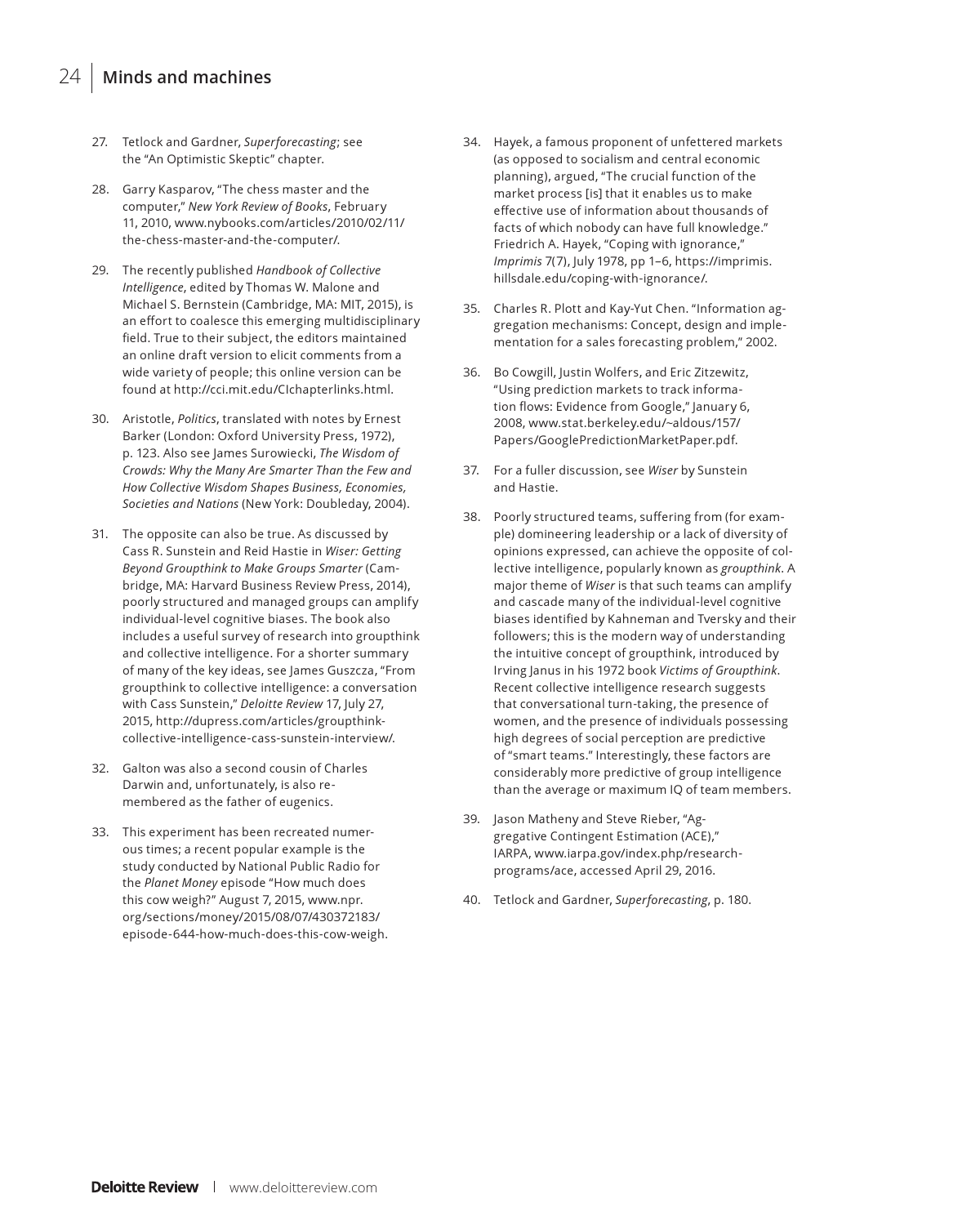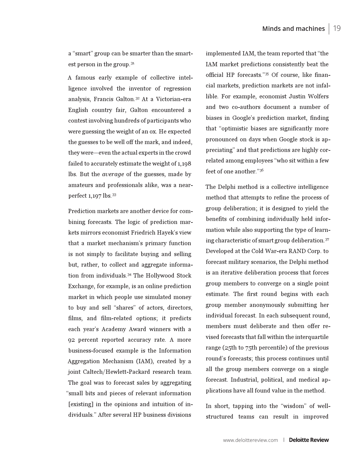 因而,人机结合是提高我们在不确定性环境下做预测和判断的能力的主要方式。另一种方法 是,改善判断过程本身。这是群体智能(collective intelligence)的一个越发突出的研究主题。简而言之,群体在搜集零散信息,以做出更好的判断和决策上,比群体内的任何个人都要好。