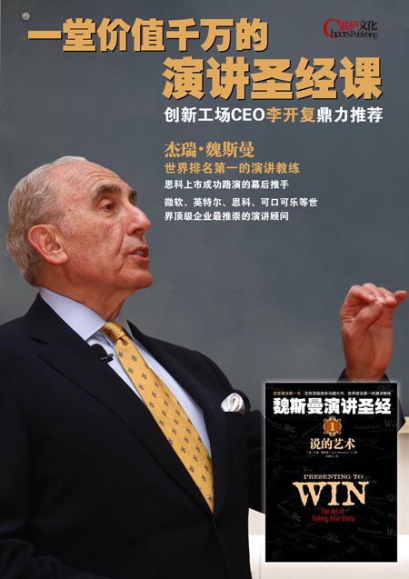 杰瑞•魏斯曼(Jerry Weissman),全球顶级商务沟通大师、世界排名第一的演讲教练,Power Presentations公司创始人,创新工场CEO李开复最信赖的演讲教练;