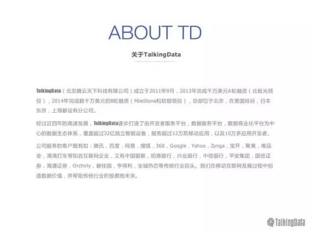 TalkingData:2016中国手游进阶之路 更多阅读:TalkingData:2022春节年货数据TalkingData:2020年“超职季”招聘市场洞察报告TalkingData:从瑞幸咖啡“崩盘”事件 探究咖啡消费人群特征差异TalkingData T11 2019数据智能技术峰会举办 AI将成为行业颠覆者TalkingData:“数”说瑞幸咖啡、星巴克人群特征TalkingData: 谈《捉妖》御灵师的画像洞察T11 2018数聚零售峰会举办,聚焦新零售变革突破以突破诠释数据的力量,2018年T11数据智能峰会即将举办TalkingData发布新战略布局 CEO崔晓波:要以开放连接促数据智能T11 2017 暨TalkingData智能数据峰会开幕倒计时,九大论坛前瞻TalkingData&宜人贷:中国消费金融发展模式研究报告TalkingData:2017年消费金融行业发展报告新年新征程,TalkingData营销云全新启航TalkingData Ad Tracking HTML5应用监测正式上线!TalkingData小程序分析服务正式上线