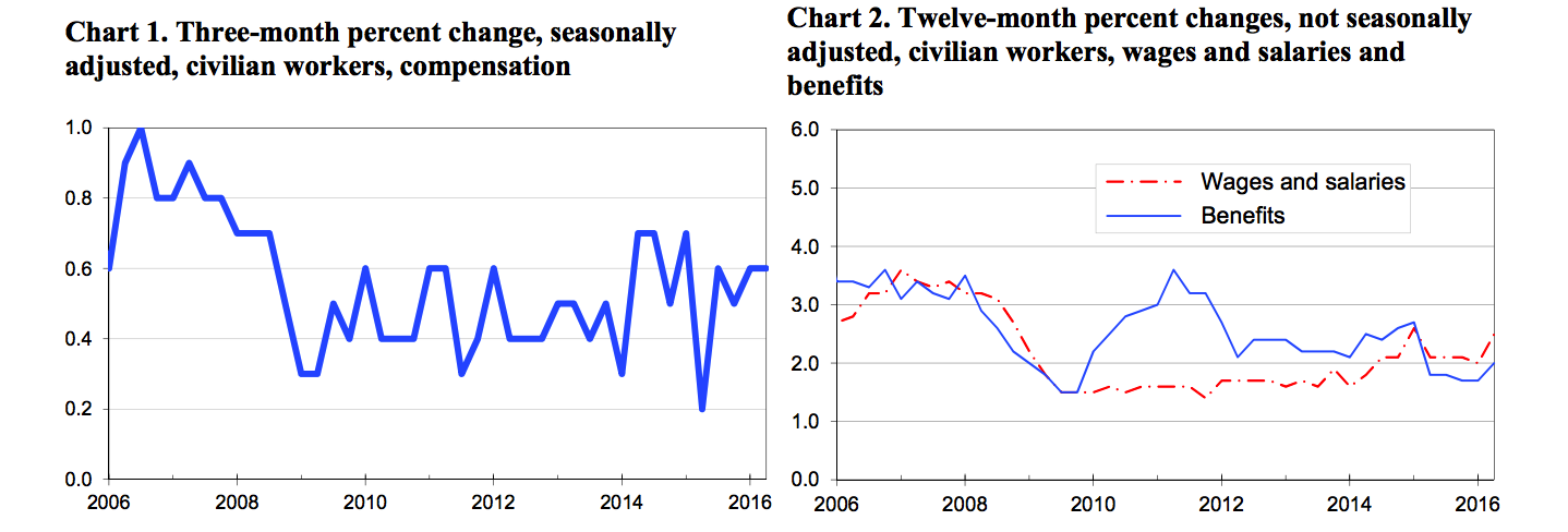 美国劳工部:2016年Q2美国雇佣成本上涨0.6% 美国劳工部周五发布的报告显示,美国二季度雇佣成本指数(ECI)经季调后环比上涨0.6%,与接受MarketWatch调查的经济学家平均预期的一致。 与去年同期相比,二季度ECI上涨2.3%,创2015年初以来最大涨幅。劳动力市场紧张、低失业率,加上多个州提高最低工资,帮助推高了员工工资和福利。 数据还显示,占雇佣成本达70%的薪资二季度增长0.6%,一季度增幅为0.7%。与去年同期相比,二季度薪资增长2.5%,一季度增幅为2%。 更多阅读:美国劳工部:2022年3月份美国职位空缺数升至1150万美国劳工部:2017年7月美国新增就业人口增长超预期 失业率小幅降至4.3%美国劳工部:2021年1月份美国职位空缺数692万美国劳工部:2020年7月美国职位空缺升至661.8万美国劳工部:2018年6月份美国非农就业人数增加21.3万人 超预期美国劳工部:2017年7月美国JOLTS职位空缺 617.0万美国劳工部:美国初请失业金人数下降 耐用品新订单月率骤降10.1%《福布斯》:2020年马斯克薪酬710亿元 成全球薪酬最高CEO2023年11月粮农组织食品价格指数平均为120.4点经济数据的新标准旨在更清晰地呈现全球经济状况世界银行:截至目前全球贸易仍保持韧性但正在急剧减速世界经济论坛:影响全球金融的五大变革性趋势非正规经济如何对新兴市场的可持续增长起到关键作用国际货币基金组织:打破债务超级周期IMF经济学专家:补贴大战