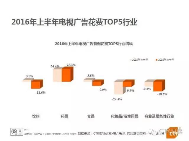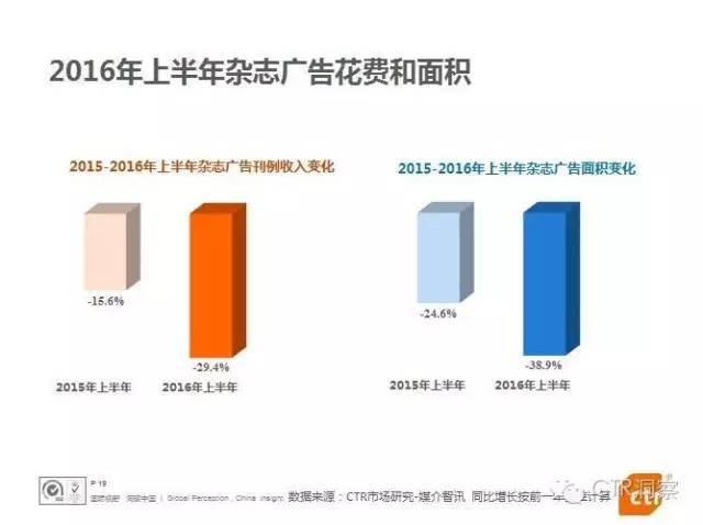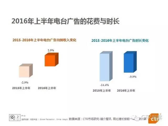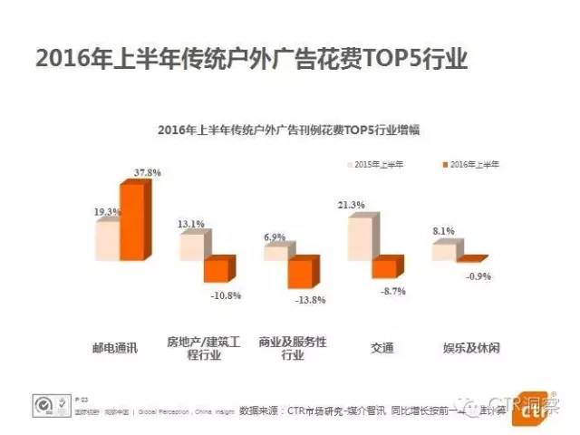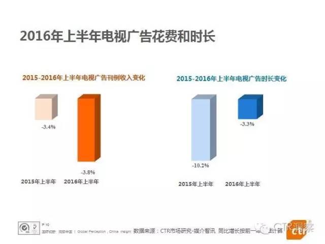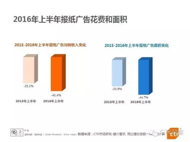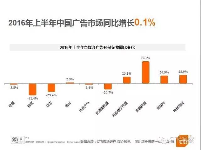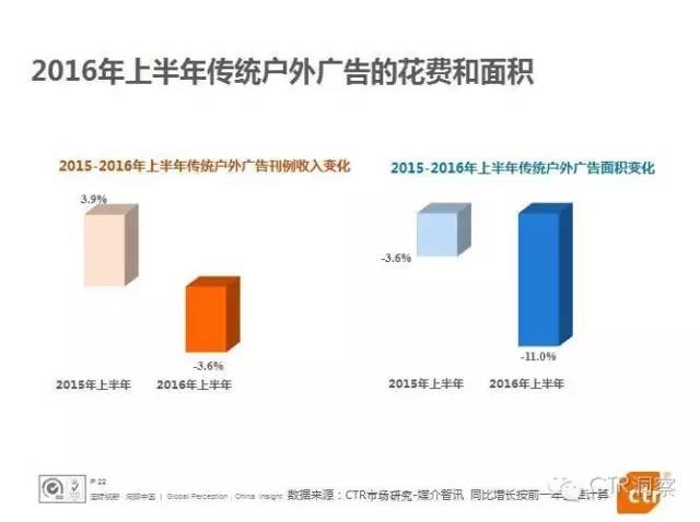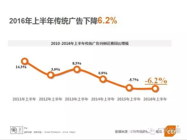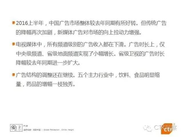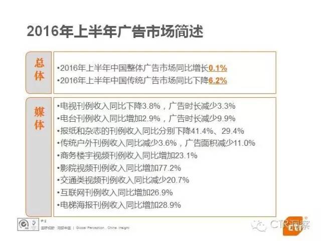 CTR:2016年上半年中国广告市场速览 * CTR市场研究最新数据显示,2016年上半年中国广告市场整体较去年同期有所好转,同比增长0.1%。但传统广告的降幅再次加剧,同比下降6.2%,新媒体广告对市场的向上拉动力增强。 * 电视媒体中,所有频道级别的广告收入都在下滑。广告时长上,仅中央级频道、省级地面频道实现了小幅增长。省级卫视的广告时长降幅较去年同期进一步扩大。 * 广告结构的调整还在继续。五个主力行业中,饮料、食品明显缩量,药品的增幅一枝独秀。 2016年上半年中国广告市场速览 市场总览 传统媒体广告概览 新媒体广告概览 回顾总结 更多阅读:CTR:中小城市青年观众电视收视特征简析CTR:2021年5月电视广告花费同比增长12.5%CTR:2016年7月乘用车广告投放月度简报CTR:2016年4月主要省级卫视广告动向CTR:2015年4月省级卫视广告时长增幅9.7%CTR:2017年3月全媒体广告分析CTR:婴幼童产品市场细分品类分析CTR:2022年1-10月电视广告刊例花费同比下跌14.1%CTR:2022年1-9月电视广告刊例花费同比下跌13.6%CTR:2022年1-7月广播广告刊例花费同比下跌8.2%CTR:2022年上半年广播广告刊例花费同比下跌7.7%CTR:2023年1-7月广告市场同比上涨5.4%CTR:2023上半年广播广告市场数据概览CTR:2023年1-4月电视广告刊例花费同比下跌6.9%CTR:2023年第一季度电视广告刊例花费同比下跌11.4%