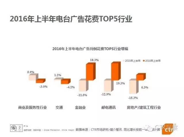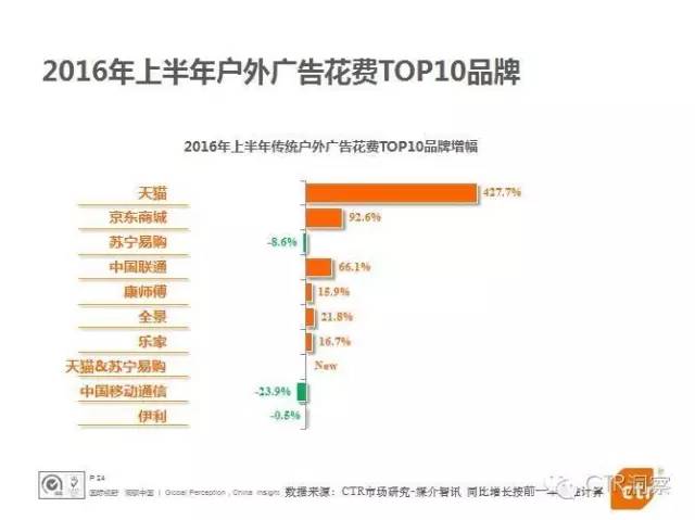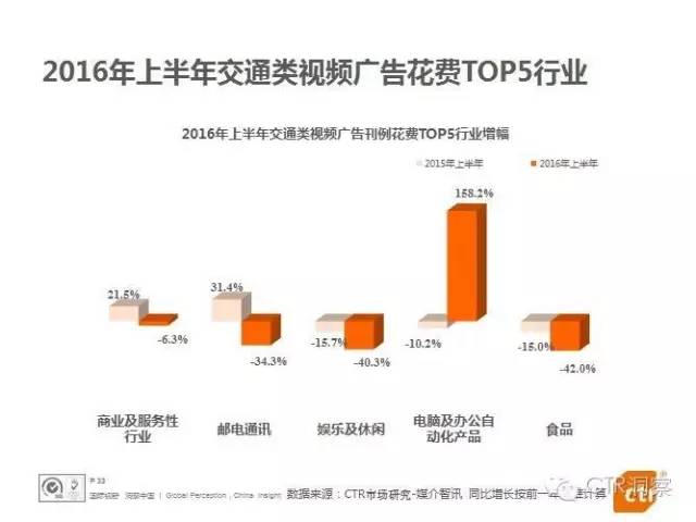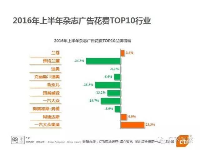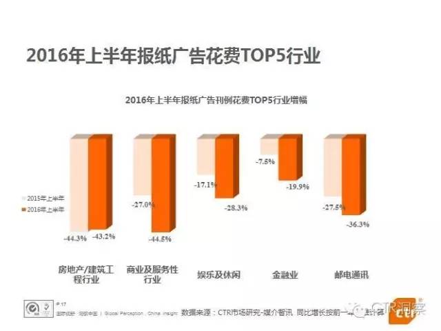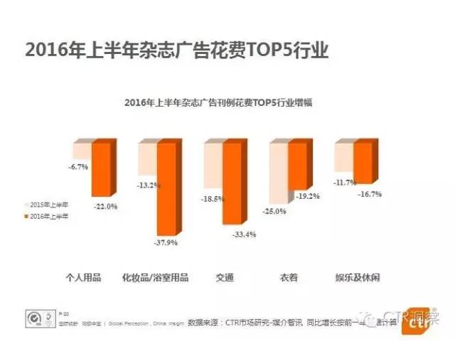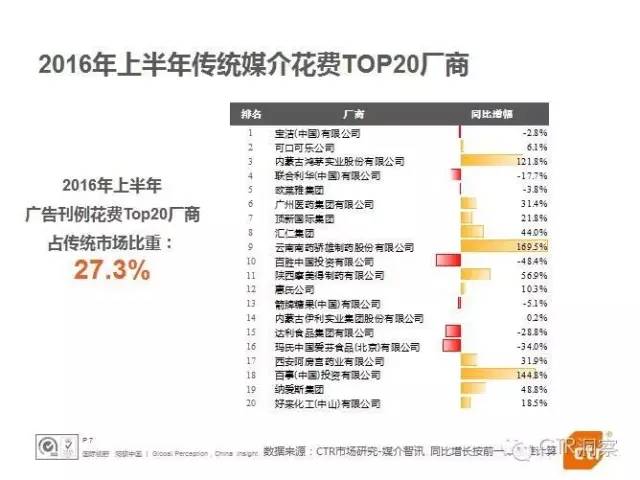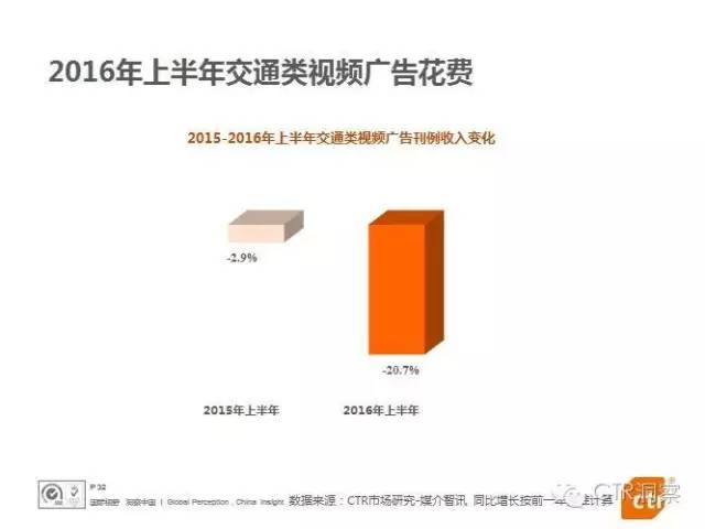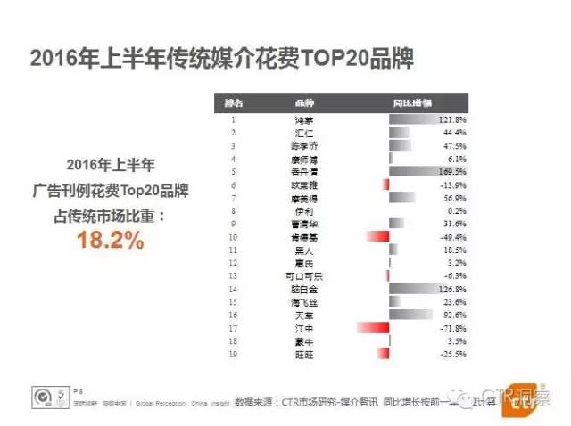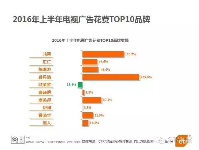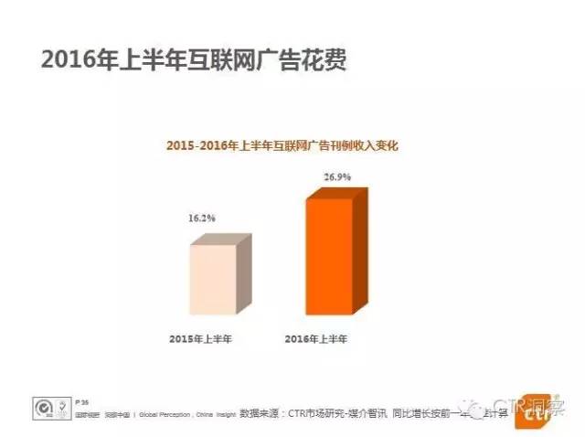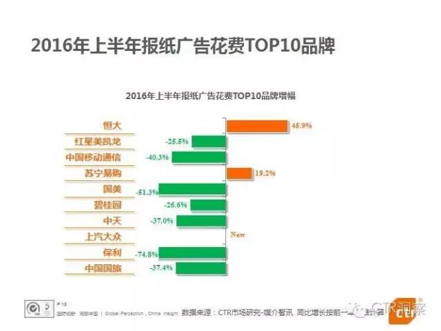 CTR:2016年上半年中国广告市场速览 * CTR市场研究最新数据显示,2016年上半年中国广告市场整体较去年同期有所好转,同比增长0.1%。但传统广告的降幅再次加剧,同比下降6.2%,新媒体广告对市场的向上拉动力增强。 * 电视媒体中,所有频道级别的广告收入都在下滑。广告时长上,仅中央级频道、省级地面频道实现了小幅增长。省级卫视的广告时长降幅较去年同期进一步扩大。 * 广告结构的调整还在继续。五个主力行业中,饮料、食品明显缩量,药品的增幅一枝独秀。 2016年上半年中国广告市场速览 市场总览 传统媒体广告概览 新媒体广告概览 回顾总结 更多阅读:CTR:中小城市青年观众电视收视特征简析CTR:2021年5月电视广告花费同比增长12.5%CTR:2016年7月乘用车广告投放月度简报CTR:2016年4月主要省级卫视广告动向CTR:2015年4月省级卫视广告时长增幅9.7%CTR:2017年3月全媒体广告分析CTR:婴幼童产品市场细分品类分析CTR:2022年1-10月电视广告刊例花费同比下跌14.1%CTR:2022年1-9月电视广告刊例花费同比下跌13.6%CTR:2022年1-7月广播广告刊例花费同比下跌8.2%CTR:2022年上半年广播广告刊例花费同比下跌7.7%CTR:2023年1-7月广告市场同比上涨5.4%CTR:2023上半年广播广告市场数据概览CTR:2023年1-4月电视广告刊例花费同比下跌6.9%CTR:2023年第一季度电视广告刊例花费同比下跌11.4%