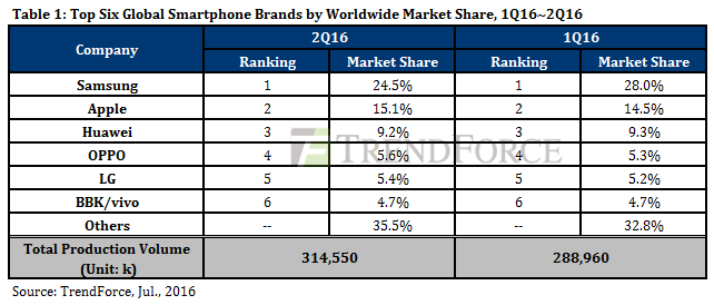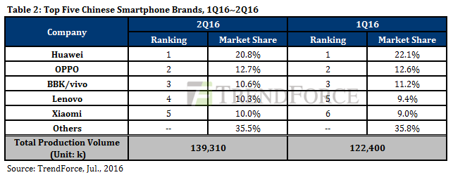 第二季华为智能手机生产数量达2,900万支,季成长约为7.4%,稳坐全球第三。然而,由于华为双镜头旗舰机P9受到其他中国智能手机品牌的夹击,销售恐不如预期,使得全年度生产数量面临下修。
