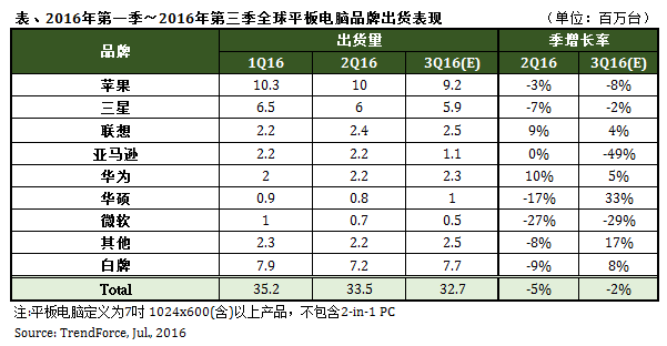 全球市场研究机构TrendForce集邦科技最新平板电脑出货报告显示,2016年第二季全球平板电脑出货3,354万台,季衰退4.8%,与去年同期相比则衰退8.8%。