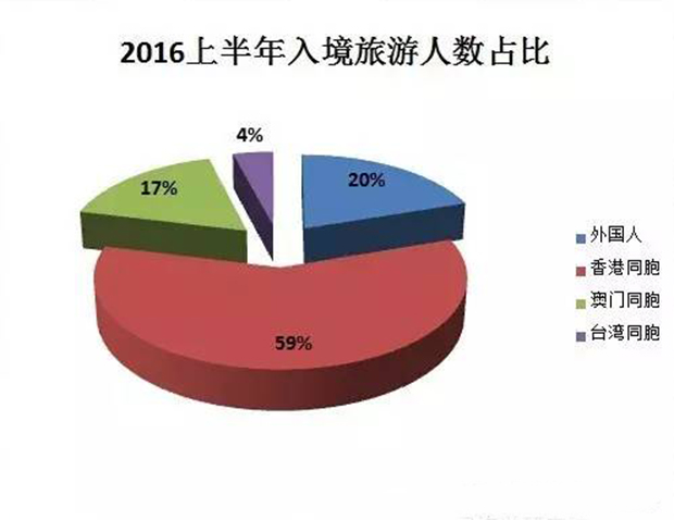 2016年1-6月,入境过夜旅游人数2887万人次,增长4.3%。其中:外国人1036万人次,增长6.8%;香港同胞1369万人次,增长2.3%;澳门同胞236万人次,增长3.5%;台湾同胞246万人次,增长6.0%。