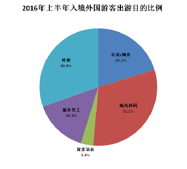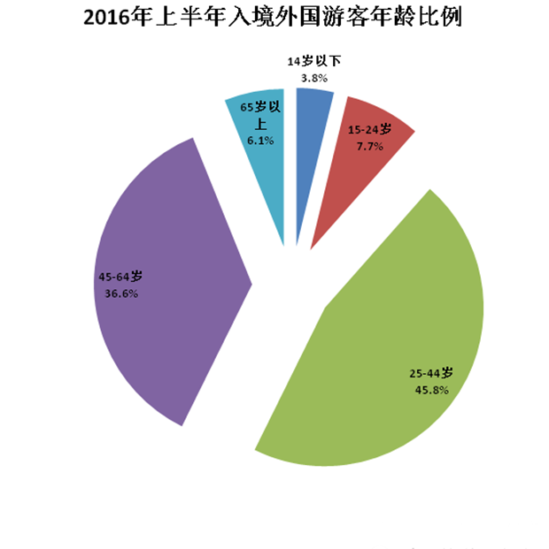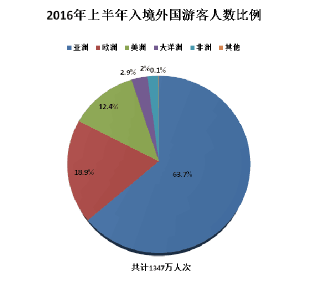 2016年1-6月,入境外国游客人数1347万人次,亚洲占63.7%,美洲占12.4%,欧洲占18.9%,大洋洲占2.9%,非洲占2.0%,其他国家占0.1%。其中:按照年龄分,14岁以下人数占3.8%,15-24岁占7.7%,25-44岁占45.8%,45-64岁占36.6%,65岁以上占6.1%;按性别分,男占64.5%,女占35.5%;按目的分,会议/商务占20.2%,观光休闲占31.2%,探亲访友占3.4%,服务员工占14.8%,其他占30.4%。