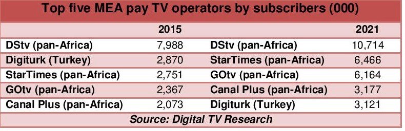 据Digital TV Research的《中东和非洲地区付费电视运营商预测报告》显示,2015年底前九大付费电视运营商的用户占比达70%,预计2021将降到66%。但这九个运营商在该地区的付费电视用户比重仍将高于三分之二。这九个付费电视运营商分别是:Multichoice(DStv和GOtv)、StarTimes/StarSat、Canal Plus、OSN、beIN、DigiTurk、D-Smart、Yes和HOT。