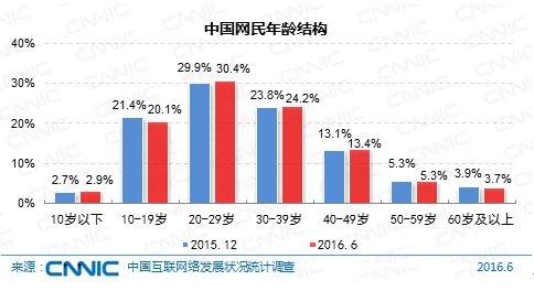 截至2016年6月,我国网民仍以10-39岁群体为主,占整体的74.7%:其中20-29岁年龄段的网民占比最高,达30.4%,10-19岁、30-39岁群体占比分别为20.1%、24.2%。与2015年底相比,10岁以下儿童群体与40岁以上中高龄群体占比均有所增长,互联网继续向这两个年龄群体渗透。