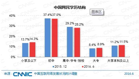 截至2016年6月,我国网民依然以中等学历群体为主,初中、高中/中专/技校学历的网民占比分别为37.0%、28.2%。与2015年底相比,小学及以下、大专、大学本科及以上学历的网民占比均有所提升。