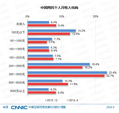 截至2016年6月,网民中月收入在2001-3000元及3001-5000元的群体占比较高,分别为16.2%和22.7%。随着社会经济的不断发展,网民的收入水平也逐年增长,对比2015年底,收入在5000元以上的网民人群占比提升了3.8个百分点。