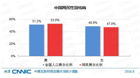 截至2016年6月,中国网民男女比例为53:47,同期全国人口男女比例为51.2:48.8,网民性别结构趋向均衡,且与人口性别比例基本一致。