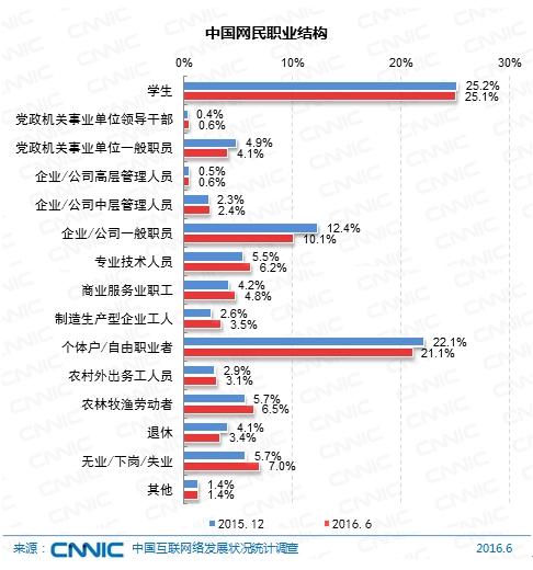 截至2016年6月,中国网民中学生群体占比仍然最高,为25.1%;其次为个体户/自由职业者,比例为21.1%;企业/公司的管理人员和一般职员占比合计达到13.1%。对比2015年底,这三类人群的占比保持相对稳定。