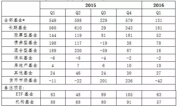 就全球来说,相对于2015年第四季度现金净流入380亿美元,2016年第一季度债券型基金现金净流入为780亿美元。2016年第一季度,混合型基金现金净流入160亿美元,相比于2015年第四季度的870亿美元。