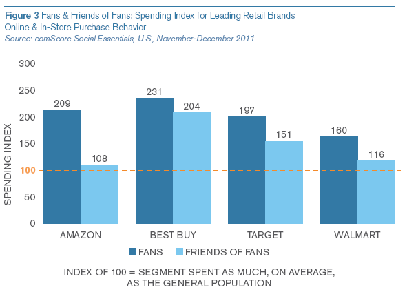 品牌不仅影响品牌的社交网络粉丝的购买意愿,还能通过粉丝网络影响粉丝好友的购买意愿。亚马逊粉丝的好友的平均消费指数为108,bestbuy则高达204,社交品牌粉丝对于电商网站的销售拉动功不可没