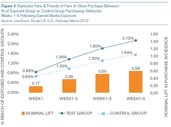 社交网络的免费媒体效果显著,以星巴克为例,研究发现星巴克免费媒体的曝光量在曝光后的连续四周内对店面销售有积极的影响。数据显示在曝光后的每一周中,曝光对购买都有正面的影响,而且对购买提升还有累积效应。