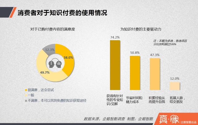 在有过知识付费行为的消费者中,有38%表示体验满意,还会尝试,49.7%表示一般,12.3%表示不满意,对于付费得到的内容自己本可以找到免费的途径来获取。