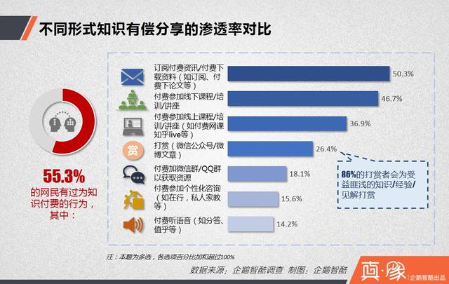 1. 超过五成网民有过不同形式的为知识付费的行为,渗透率最高的是订阅付费咨询和付费下载资料(50.3%);