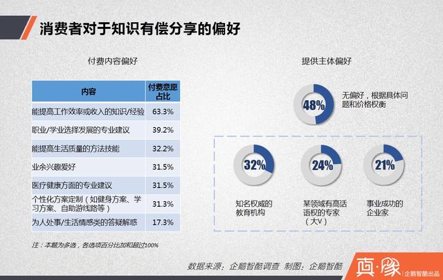 综合来看消费者对于付费内容和付费对象的偏好,由权威机构或者精英人士提供的个性化“干货”相对最能调动消费者的购买意愿。