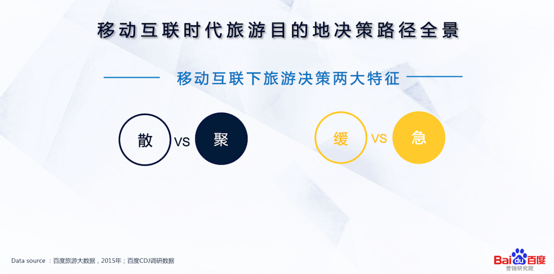 连续研究旅游消费者3个月目的地决策全路径、全触点、全场景,我们发现移动互联时代消费者决策两大特征:散VS聚,缓VS急。