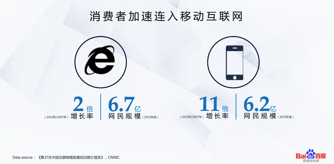 今天,移动网络和智能手机快速普及,全民跑步进入移动互联网时代。2005年苹果公司发布第一款智能手机,开启移动互联网飞速发展的大门。根据CNNIC公布的数据,截止2015年底,移动网民增长了11倍,移动网民规模达到6.2亿,占到全体网民的93%。InMobi发布的2015年《中国移动互联网用户行为洞察报告》显示,移动互联网用户平均每天使用时长104分钟,在移动端购物、支付、拍照、游戏、导航、聊天、分享、…移动互联网已渗透消费者生活的角角落落。