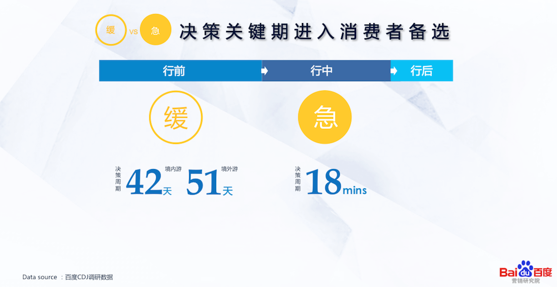 你与消费者的互动选对时间了吗?旅游消费者决策包括行前目的地选择和行中边走边订。行前决策深思熟虑,周期长达42天,境外游更是长达51天。行中消费者当机立断,决策周期平均只有18分钟。