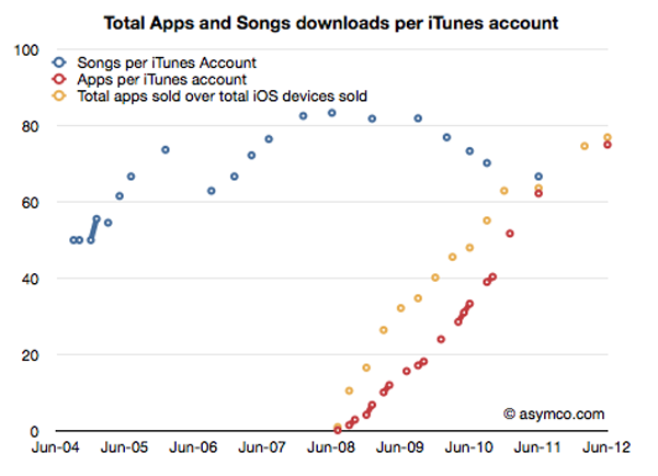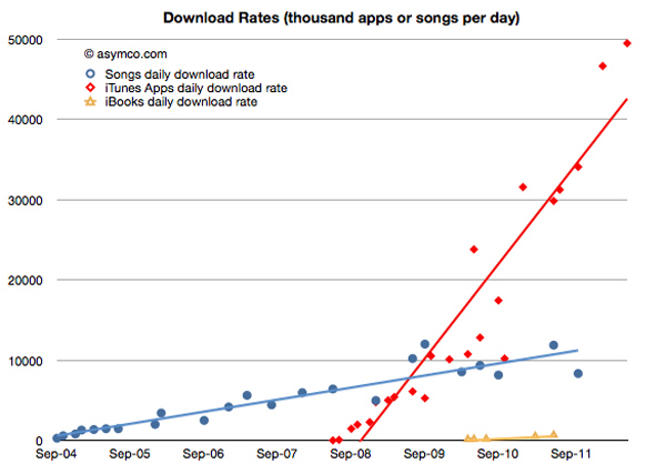 由于基础用户数量的增加,应用软件的下载量也在持续上升。如今每天大概有4950万个应用被用户所下载。上面的图除了统计下载数据外,还加入了iTunes用户下载歌曲和电子书的数据,使得整个图的信息量骤然增加。虽然用户基数是相同的,但是应用下载的增长速度是另外两个的4倍有余。