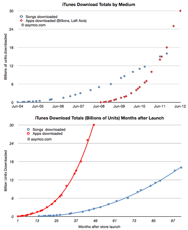 经过了很短的时间,应用下载的总量就达到了音乐下载总量的两倍。从另一个角度看图,当苹果应用的下载量达到3000万的时候,音乐商店的下载量仅为300万。