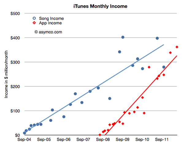 一般情况下,支付音乐的价格比购买应用的价格要贵。根据上图的数据可以推测,未来应用软件给苹果带来的收入很有能要超越音乐所带来的收入。另外,图中标出的应用收入只是总体收入的30%(在应用商店的收入比例分成中,苹果只收取30%)。换句话说,应用已经是一个很庞大的业务。