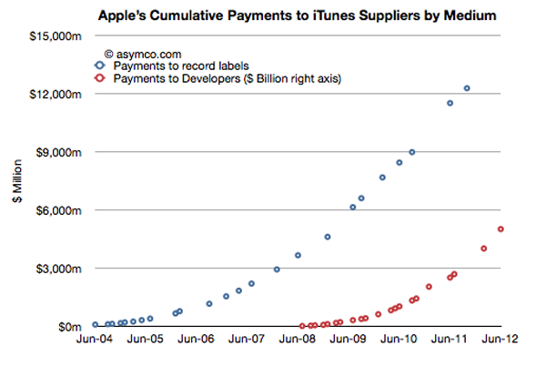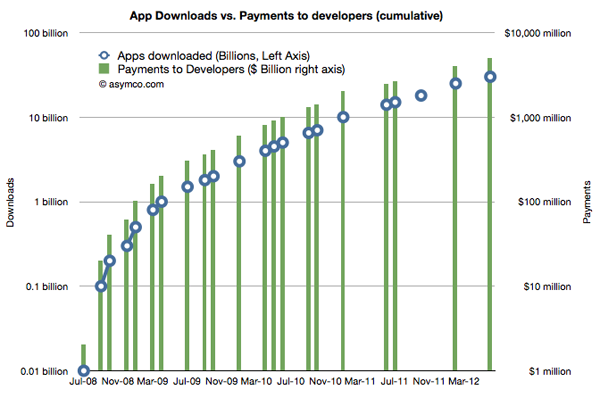 在今年的WWDC大会上,苹果公布了一些关于自家应用生态的数据:目前应用下载的总量达到300亿次;应用开发者获得了50亿的收入分成;iTunes的账户数目达到了4亿。因为苹果公布的内容还是非常表面的,所以Asymco公司利用自家的数据对苹果应用生态的状况进行更深的分析,并给出了下面的几个表格。从这六个表格中我们可以看出,应用下载的总量在不断的上升,而且增长的幅度也是十分惊人的。而开发者的收入也在不断增加。