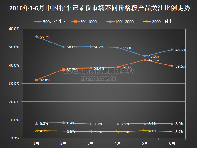 可以看到,2016年1-6月,500元以下行车记录仪,各种指标呈下降趋势,而500-1000元档位的产品,关注比例略有升高。这说明,消费者已经开始想更高级的产品投入了目光。而更加高端的产品,则变化趋势不明显。