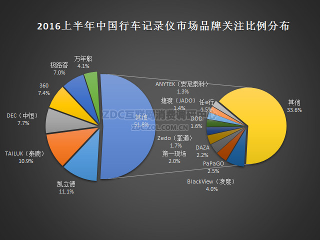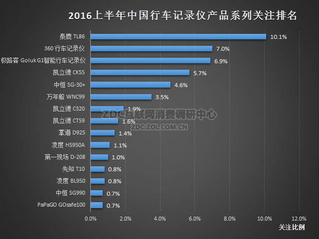 从我们的海量数据来分析,截至2016上半年,行车记录仪品牌关注度前三甲分别是凯立德、泰鹿、中恒,其中凯立德占比达到了11.1%,泰鹿占比为10.9%,中恒占比为7.7%。前三名的占比已经达到了30%,占比还是很高的。