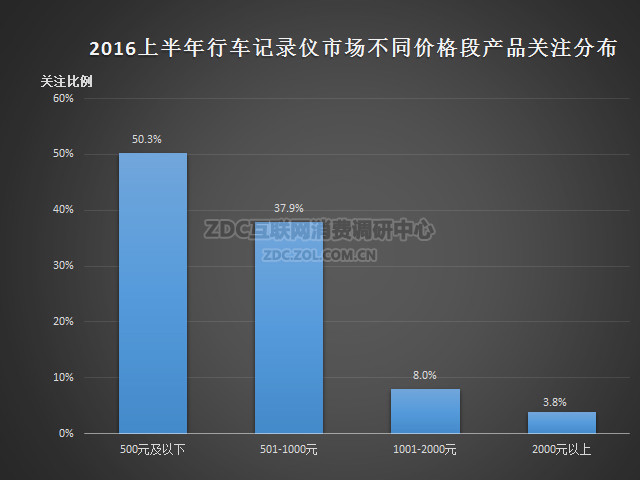可以看到,在行车记录仪市场,500元以内的产品关注很高,占比超过1半,而500-1000元也有将近38%的份额,而高端产品,仅有10%出头而已。可以看出,消费者更多的是把它当做一个纯功能产品,并不想花费太多,能有基本的功能就够了。