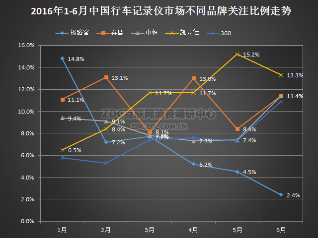 在2016年1-6月之间,一些主力品牌的关注度还是有不小的变化的。极路客的关注度,从1月最高的14.8%,骤降到6月的2.4%。而凯立德和360,则是稳步提升。