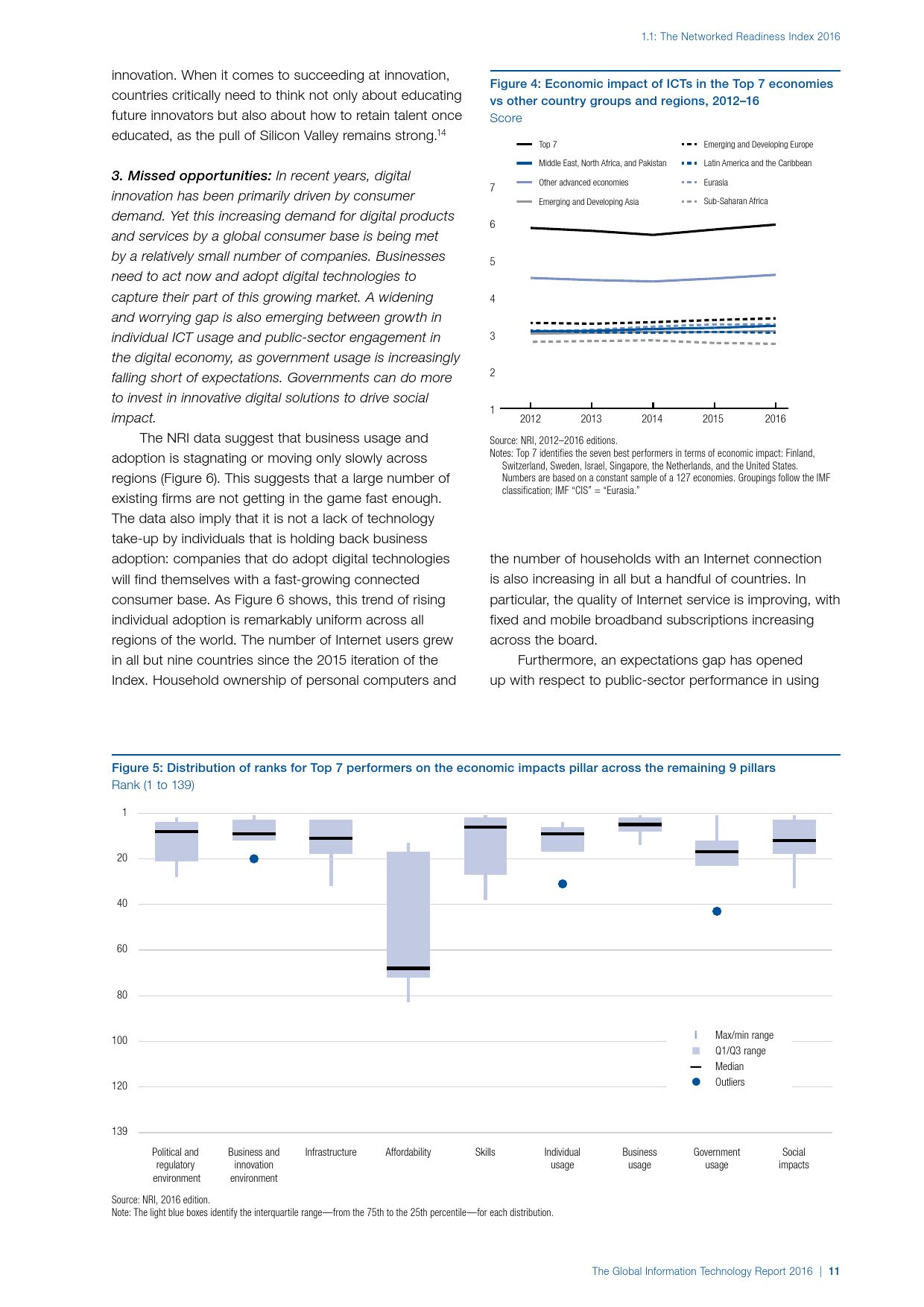 七个国家在网络创新对经济影响方面脱颖而出,分别是芬兰、瑞士、瑞典、以色列、新加坡、荷兰、和美国,这七个国家的信息通信技术水平都很高。同时,科技带来创新可能性更多,这也给企业创新带来更大的竞争压力。