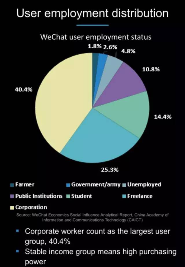 接下来是微信用户的职业分布。最多的是企业员工,达到了40.4%,位居第二的是自由职业者和个体户(25.3%),排名第三的是学生族(14.4%)。收入稳定的群体具备较高的购买力!看来微信就指着这些用户消费交易来挣钱啦~