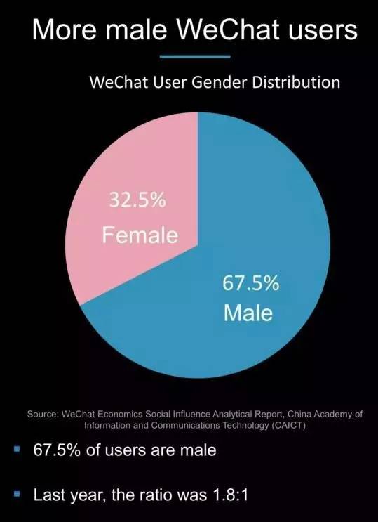 对!你没看错!微信的男性用户比例高达67.5%,较去年1.8:1的男女比例有所上升。这个结果大概颠覆了大多数人持有的“女生才爱聊天”这个观点吧!当然,也有可能是因为微信功能的日益增多,男生越来越依赖于微信进行在线支付、充值、购物等服务。这也意味着,微信已经由一个聊天工具成功升级为一款多用途高用户粘度的超级app。
