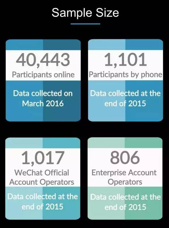 本次调查样本覆盖40443名网友(截至2016年3月),1101位电话受访者(截至2015年底),1017名公众号运营者(截至2015年底),806名企业号运营者(截至2015年底)。