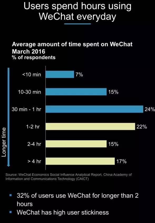 32%的用户每天使用微信时间超过2小时,这个用户粘性真是吓死宝宝了!可怕!