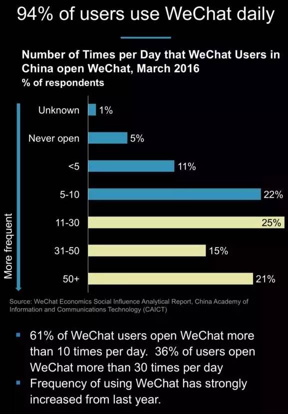 超过6成的用户每天打开微信超过10次,重度用户(也就是每天打开超过30以上的用户)达到了36%。这一年内,用户使用微信的频率明显增高。怎么办?以后不仅开某宝要剁手,开微信也得剁了!