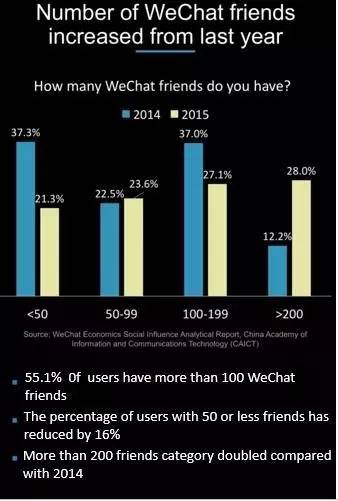 55.1%的用户好友人数都超过了100人,而拥有50位以下好友的用户百分比则下降了16%,好友数超过200人的微信用户人数已经比去年翻了一番还要多!看到这你还不拿出手机看看微信里有多少个好友?