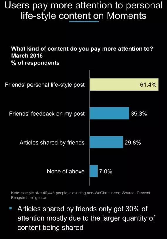你瞅瞅,大家就关心朋友的life style。61.4%的用户关心好友生活状态,而转发内容的关注度只有30%辣么低。怪不得老王发个自拍点赞人数永远比我的文学巨著分享量高很多!我这么有才华的一个人为什么要靠脸吃饭?我不服啊……