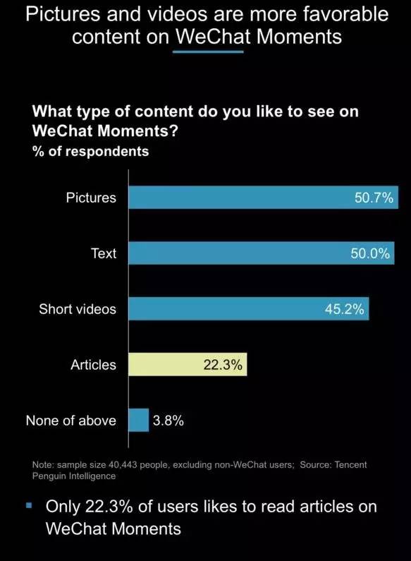 现在这时代啊大家都不爱看字,整几张图最靠谱。于是图片和短文字成为朋友圈里比较受欢迎的内容(受欢迎比例分别为50.7%和50.0%)。小视频就稍微差点,因为流量贵啊- -让我们文字工作者比较伤心的是只有22.3%的用户会看朋友圈分享的文章。
