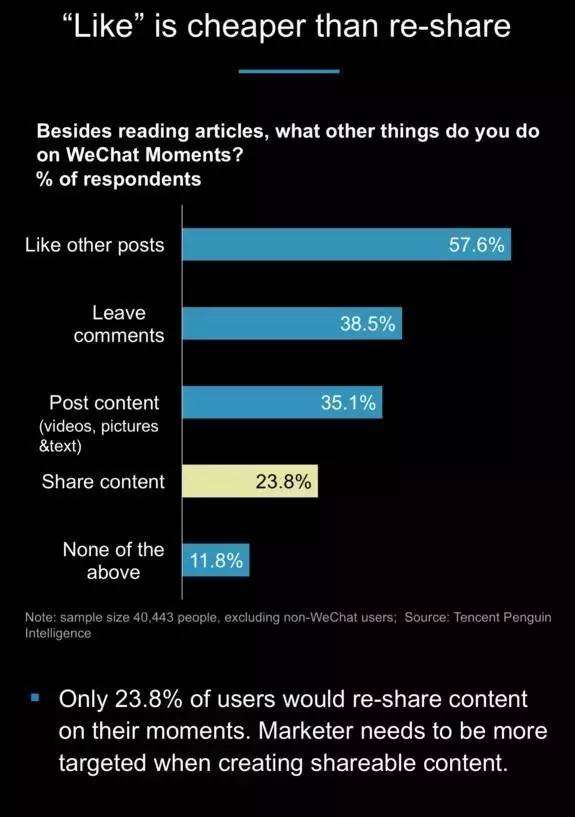 57.6%的用户都会点赞,38.5%的用户会附上评论,但是只有23.8%的人会分享。上图的数据说明了点赞党是多么可怕的一个群体。每次看都不看就给人家先点个赞再说!老王这种作家最受不了你们这种不尊重文学工作者的行为了。你要不看,你为什么要点个赞让我瞎激动啊.你们能不能学学那11.8%的同学,人家啥都不做,就安静地做个美男子或者美少女。